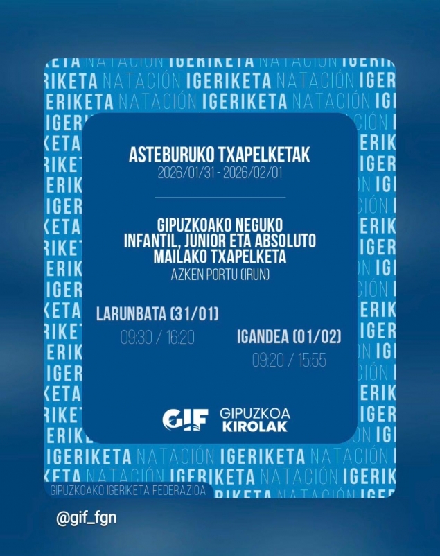 Asteburu honetan, urtarrilaren 31n eta otsailaren 1ean, Gipuzkoako Neguko IgeriketaTxapelketa jokatuko da Iruneko Azken Portu igerilekuan. Hitzordu garrantzitsuaizango da lurraldeko igerilarientzat, infantil, junior, sub-20 eta absolutu mailetan.